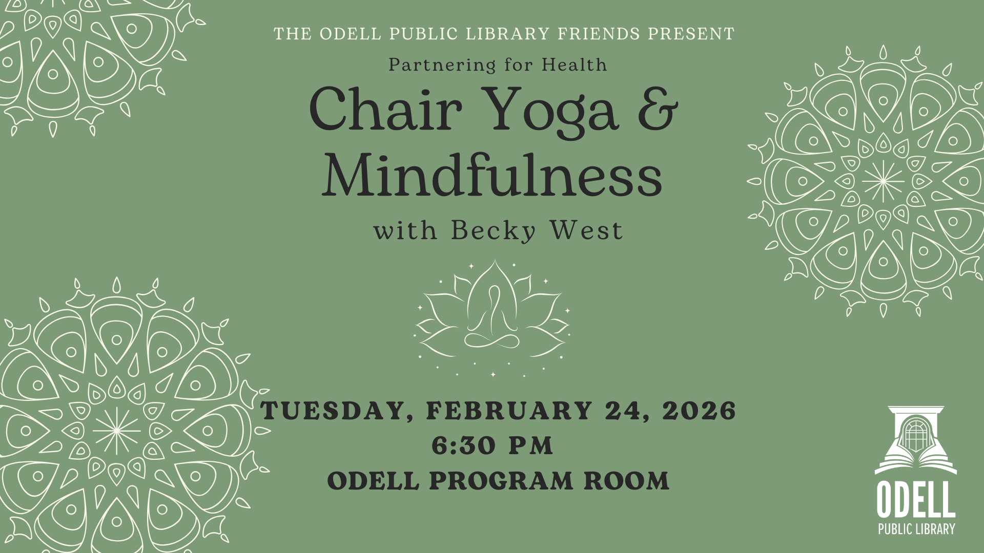 If you encounter any accessibility barriers when using the Library’s website or apps, or if you would like to report any accessibility concerns, whether digital, technological, or physical, or if you would like to request reasonable accomodations, please contact us at odell.library@gmail.com. We will provide effective communications to provide you with accessible content and reasonable accomodations that address your needs.